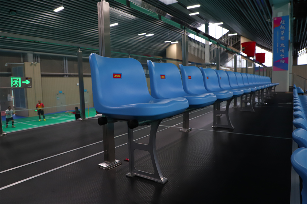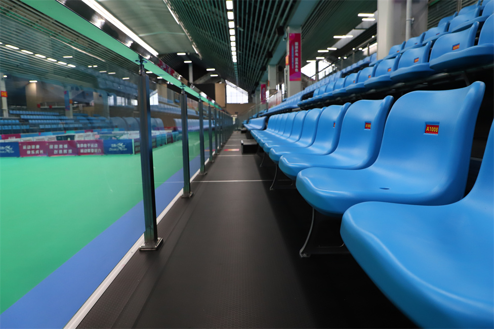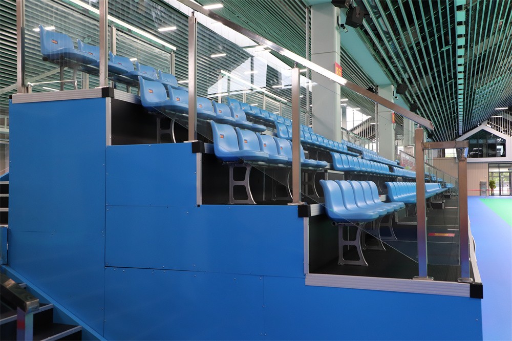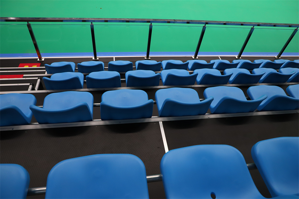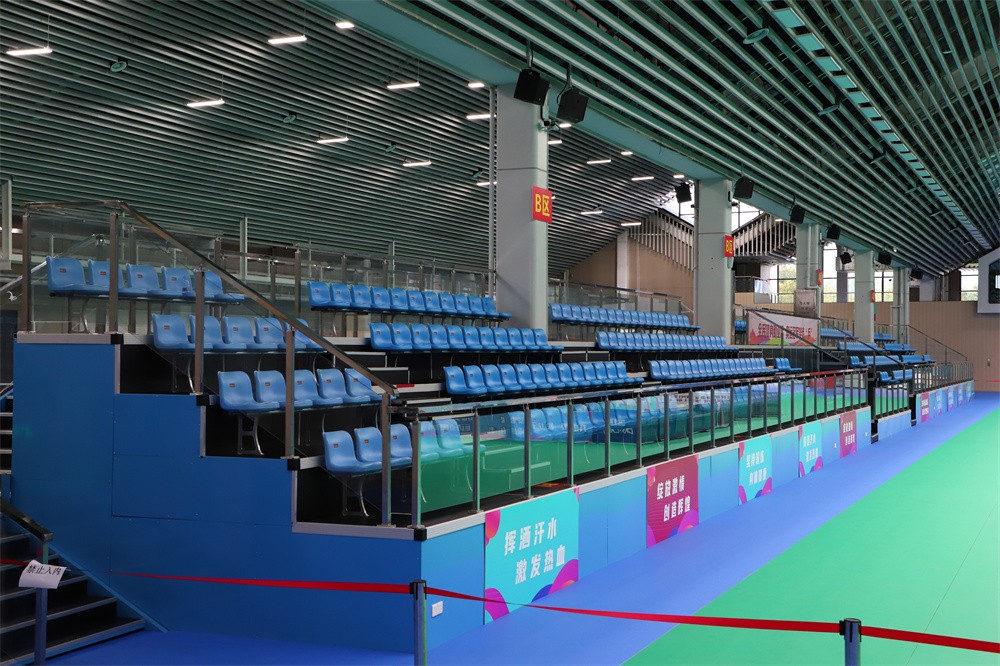 Our company's Chuangxiong grandstand consists of 99 rear mounted gas assisted chairs with telescopic stands, 687 upright seats with fixed metal stands, and 24 fixed metal stands for the chairman's seat. The fixed metal grandstand is fully enclosed with metal plates on all sides after the first floor reaches a height of 1 meter, and sprayed with paint in the same color as the seats to achieve overall coordination. The upper and lower passages are set on the side and rear of the stands, with a connecting area of a 1.8-meter-wide passage, supplemented by glass guardrails, creating an overall high-end and atmospheric atmosphere.